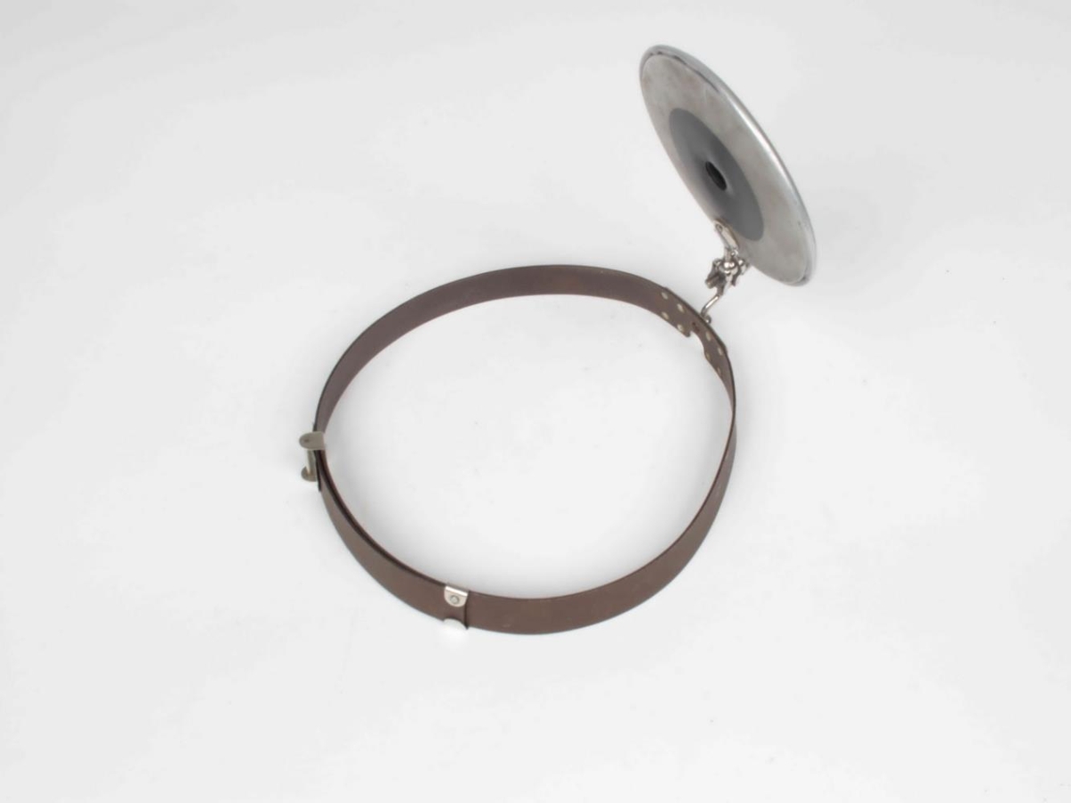 Ziegler's ennisspegill með álmhlíf á brúnri ennisgjörð, ómerkt. Aesculap A-7685 Reflerspiegel nach Ziegler, mit Stirnbaued (zwas fiber. merkt: REMEDIA H.F. CHROM.