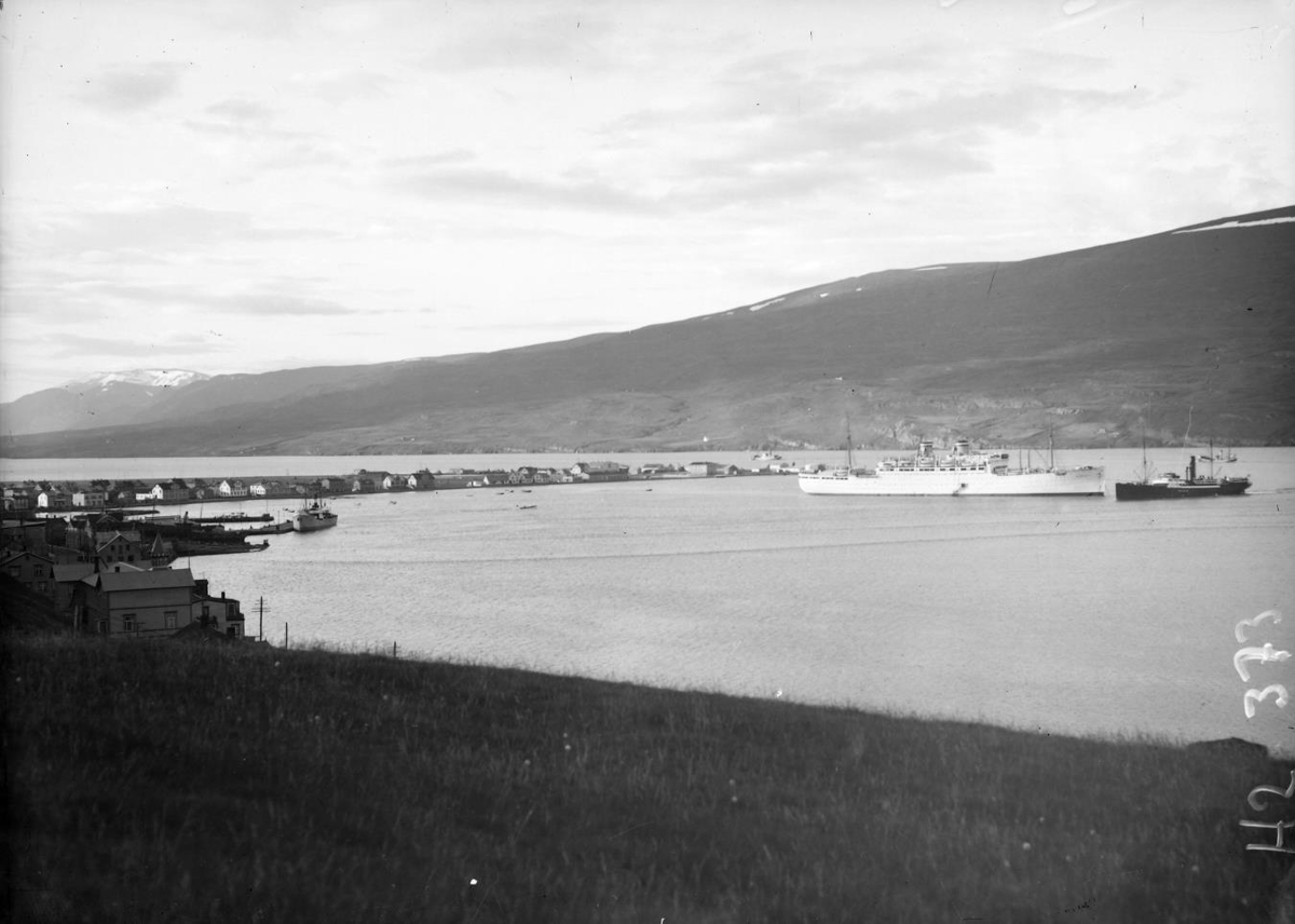 Yfirlitsmynd af Akureyri, horft til norðurs að Oddeyri. Á Pollinum liggja tvö skip, annað þeirra er stórt skemmtiferðaskip líklega þýska skipið Milwaukee en fyrir aftan það er e/s Island.