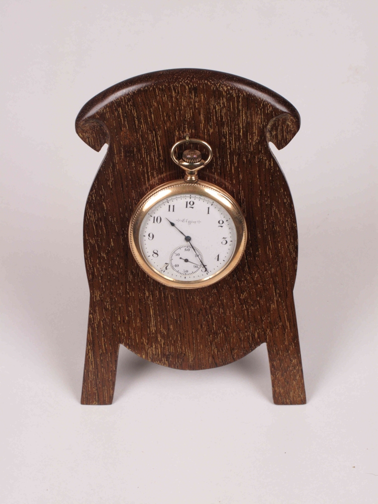 Vasaúr úr málmi, gyllt, kom ásamt blárri flauels skjóðu og viðar statívi. Statívið er gert fyrir úrið svo að það geti staðið á borði. Á því er krókur svo að úrið geti verið hengt þar á.