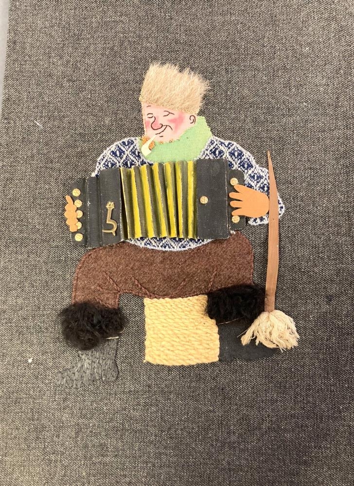 Klippimynd eða saummynd á dökkgráa einskeftu, 44x32 cm. Sitjandi harmonikuleikari, klæddur í peysu, brúnar buxur, svört leðurstígvél á fótum, loðhúfa, reykjarpípa í munni. Óársett verk Sigríðar Gísladóttur