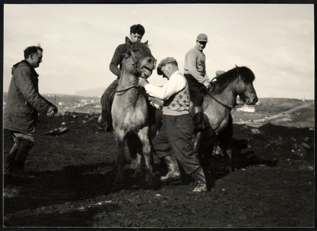 „Maðurinn sem heldur í hestinn er Þorgeir Jónsson bóndi í Gufunesi. Myndin er augljóslega tekin á skeiðvelli Hestamannafélagsins Fáks, sennilega um 1950. Maðurinn til vinstri er Magnús frá Mel í Blesugróf, man því miður ekki hvers son, Jónsson eða Magnússon, en þekktur hestamaður í Reykjavík á sínum tíma. Starfaði hjá Hestamannafélaginu Fák sem umsjónamaður hrossa á vegum félagsins. Myndin er því sennilega tekin um það bil 1960. Hesturinn gæti verið Gnýfari frá Gufunesi.“ (BG 2019)