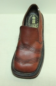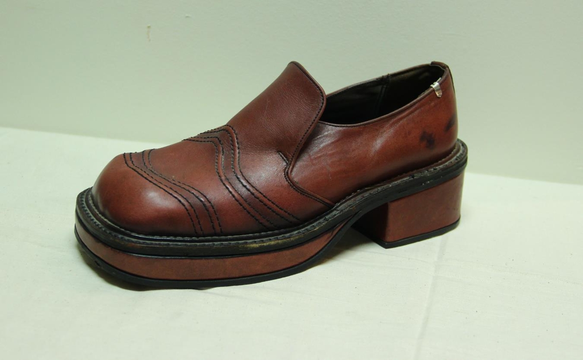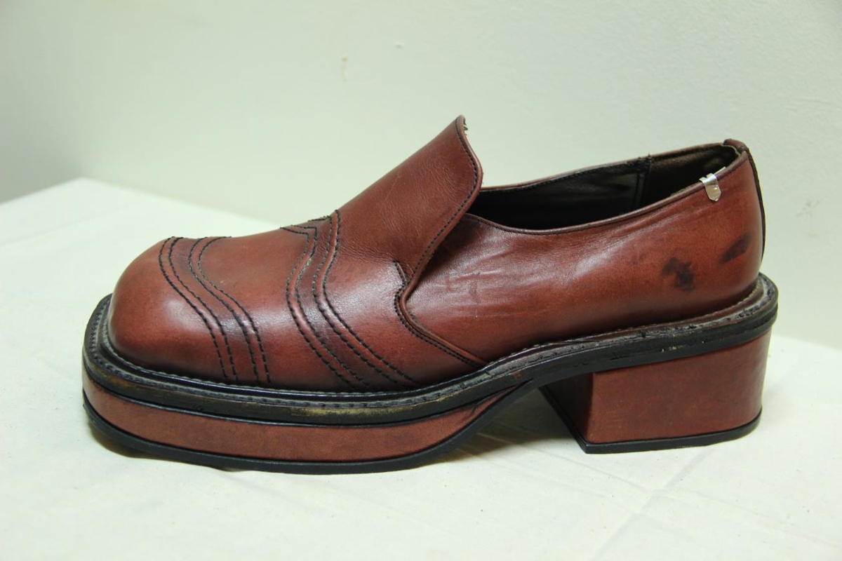 Skórinn er rauður, hælahár, með þykkum sóla og breiðri tá. Gefandinn var lengi verkstjóri hjá Iðunni skógerð.