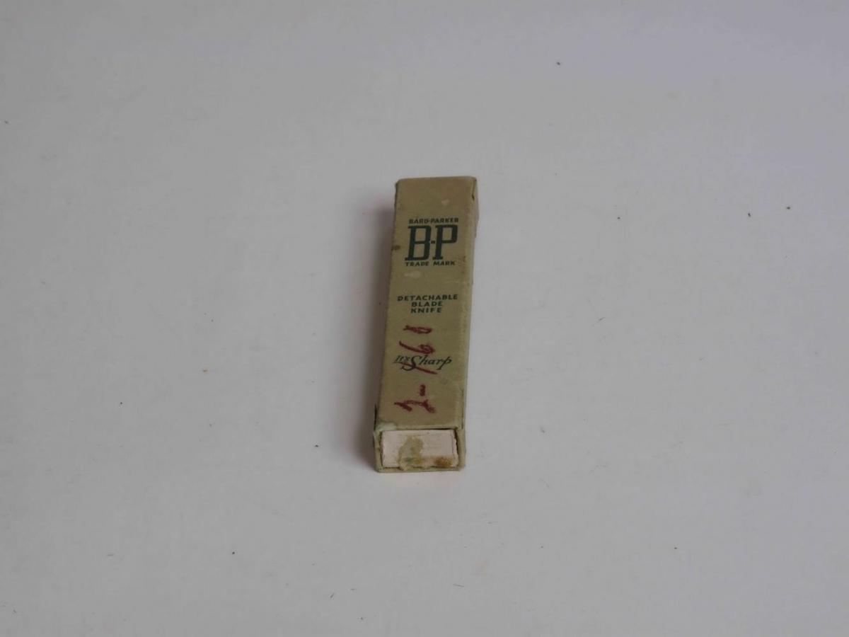 Sjá NS-4522. Blöð á skurðhnífa. Blöðunum er pakkað sex saman í vaxborinn pappír sem síðar er stungið í grænt pappírsslíður. Pappírsslíður liggja saman í þar til gerðum, löngum og mjóum pappakassa (Lengd: 14 cm). Ekki er ljóst hversu mörg blöð hafa upprunalega verið í kassanum er nú eru tvö græn pappírsslíður í honum, annað óátekið með 6 blöðum í en hitt með 5 blöðum í. Á pakkningunni stendur að blöðin sem af stærðinni 20.