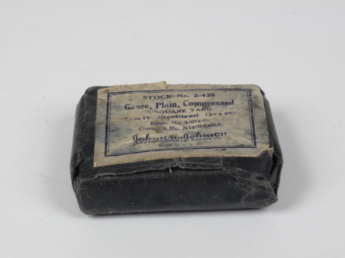 Sjá NS-4522. Blár grisjupakki með hvítum miða sem meðal annars stendur á: Gauze Plain Compressed Square Yard Type IV Sterilized (24 x 20). Óopnaður.