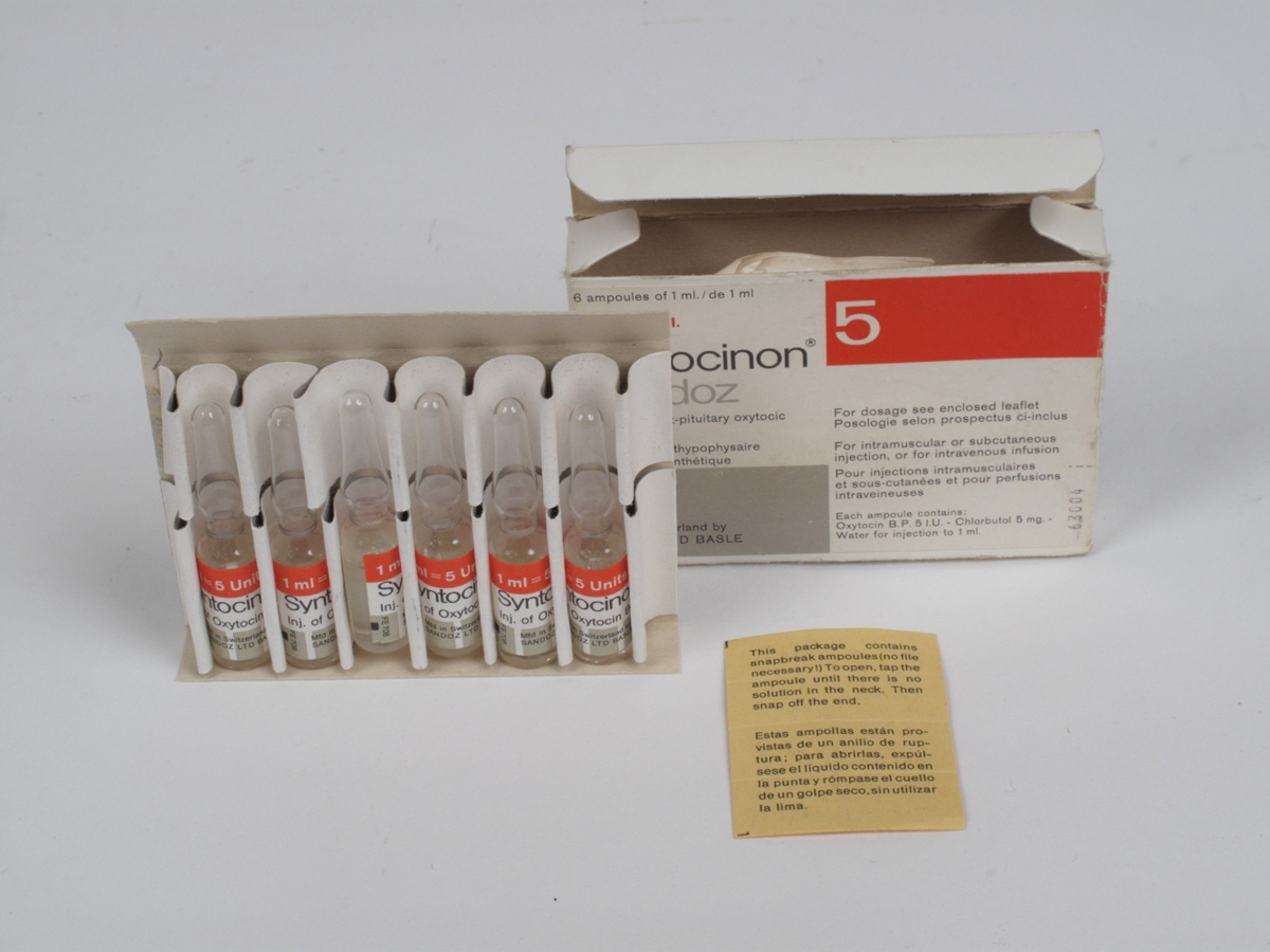 Sjá NS-4522. Askja fyrir litlar einnota flöskur. Á pakkninguna er meðal annars prentað: Syntocinon. Sandoz. Synthetic post-pituitary oxytoxic hormone. Pakkningin er fyrir 6 flöskur og eru þær allar í henni.