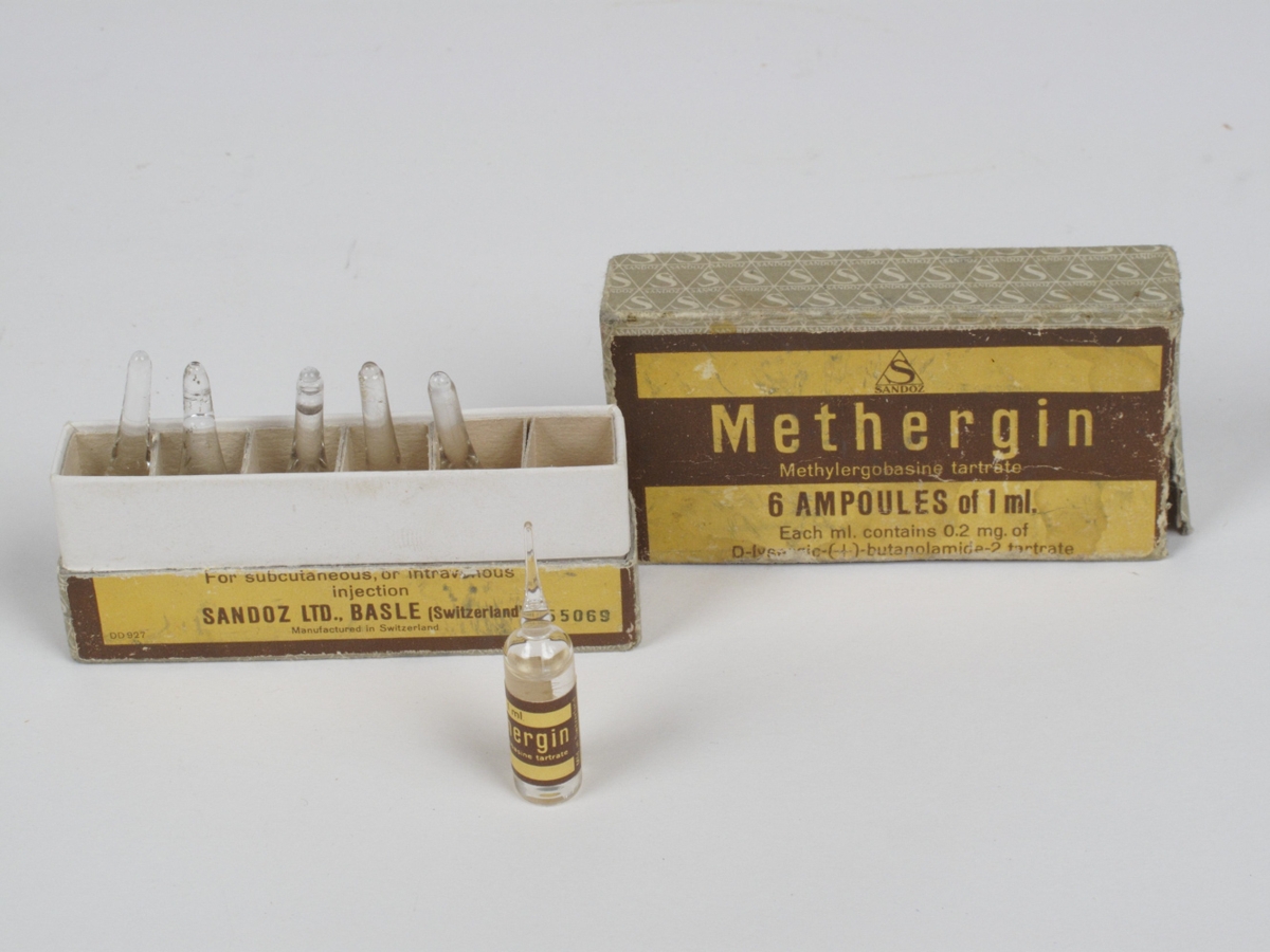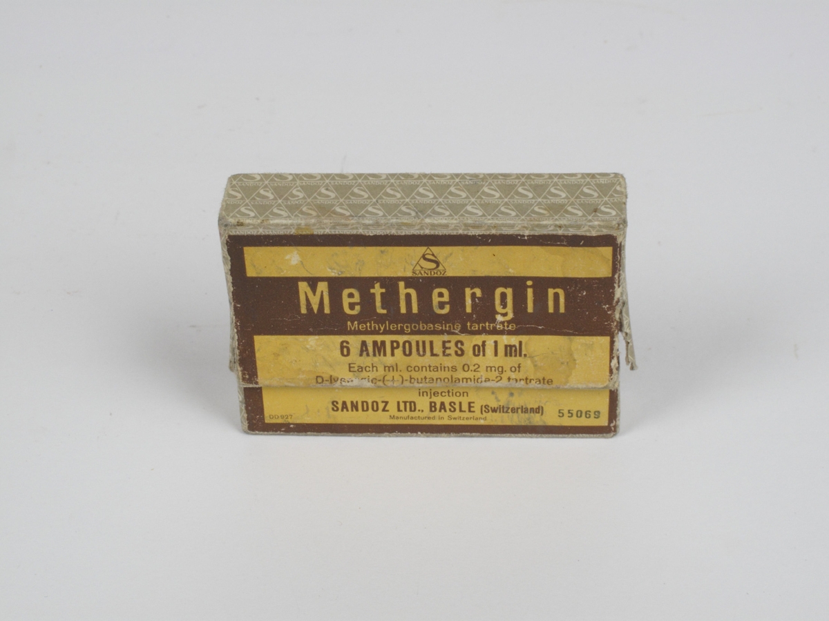 Sjá NS-4522. Askja fyrir litlar einnota glerflöskur. Á miða á öskjunni stendur meðal annars: Methergin. Methylergobasine tartrate. 6 Ampoules of 1 ml. Í öskjunni eru 6 flöskur. Ein upprunanleg, þ.e. með Methergin en hinar með Pituitrin.