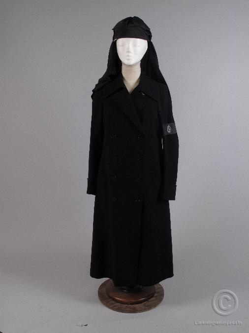 Dökkblár hattur úr crepe du chine. Snið. Efnið fellt á börð við sléttan koll, hvít brydding við ennið, þríhyrnd slæða er fellur aftur og nemur við frakkaspæl (úr tímariti hjúkrunarkvenna 1926).