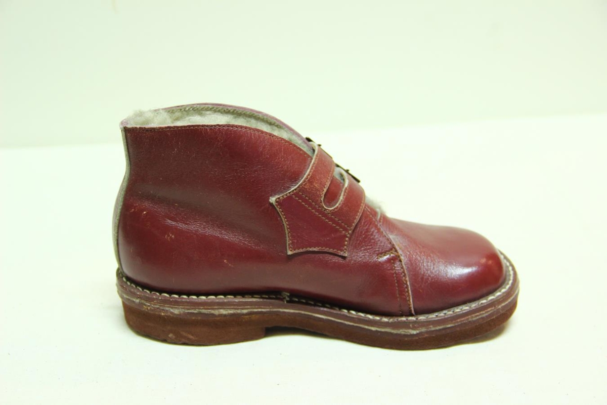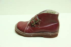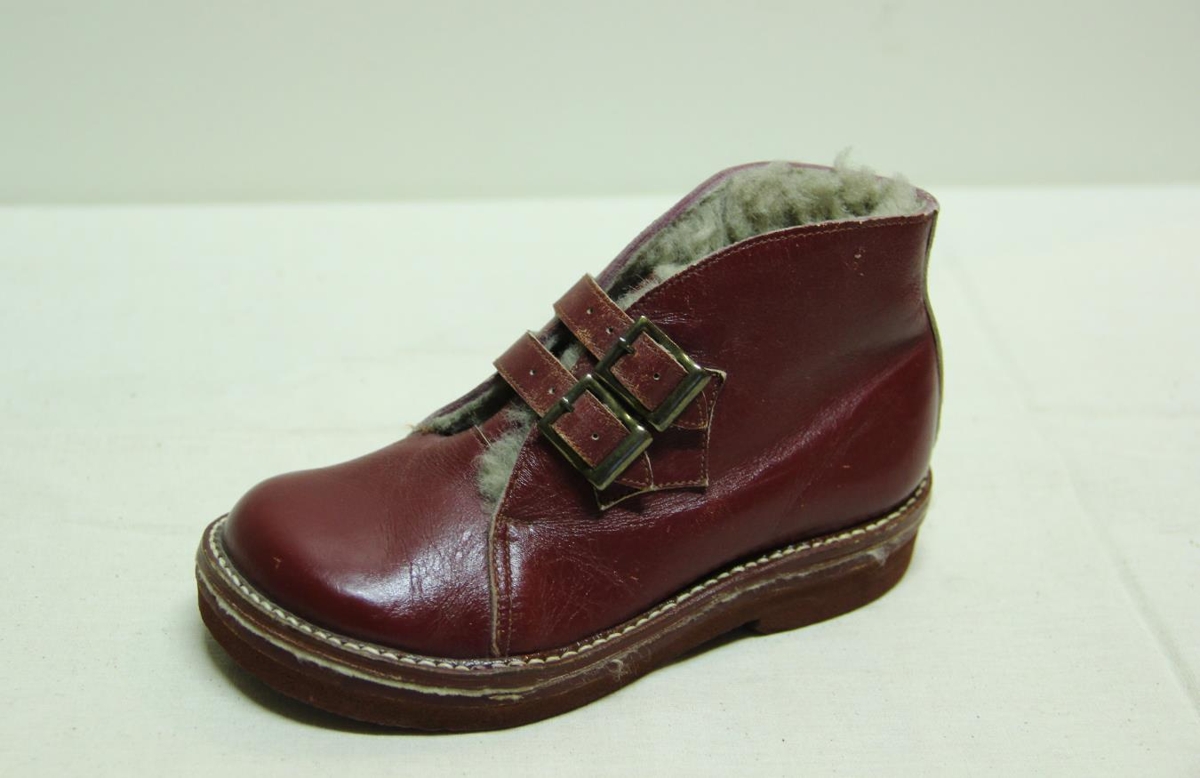 Rauður skór með tveimur spennum. Fóðraður með lambsskinni og er með gúmmísóla. Stærð: Fyrir 8 ára barn.