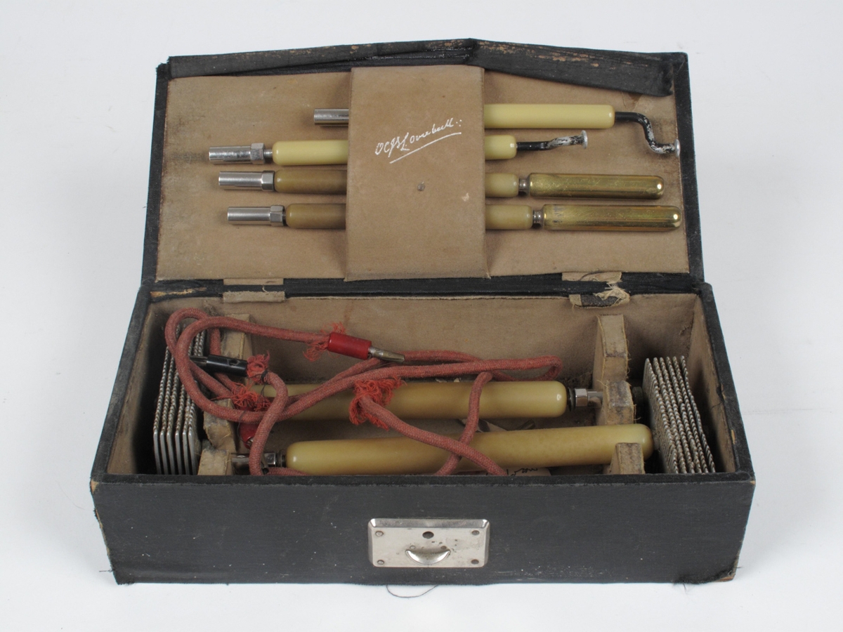 Raflækningatæki í tveimur svartklæddum kössum. Stærri kassinn var fyrir rafhlöðu, upprunalega rafhlaðan er ekki lengur í kassanum. Í minni kassanum eru handföng með tengistykki á öðrum endanum en mismunandi löguðum hausum, tveir og tveir eins. Í kassanum eru líka tengisnúrur til að tengja handföngin við rafhlöðuna.