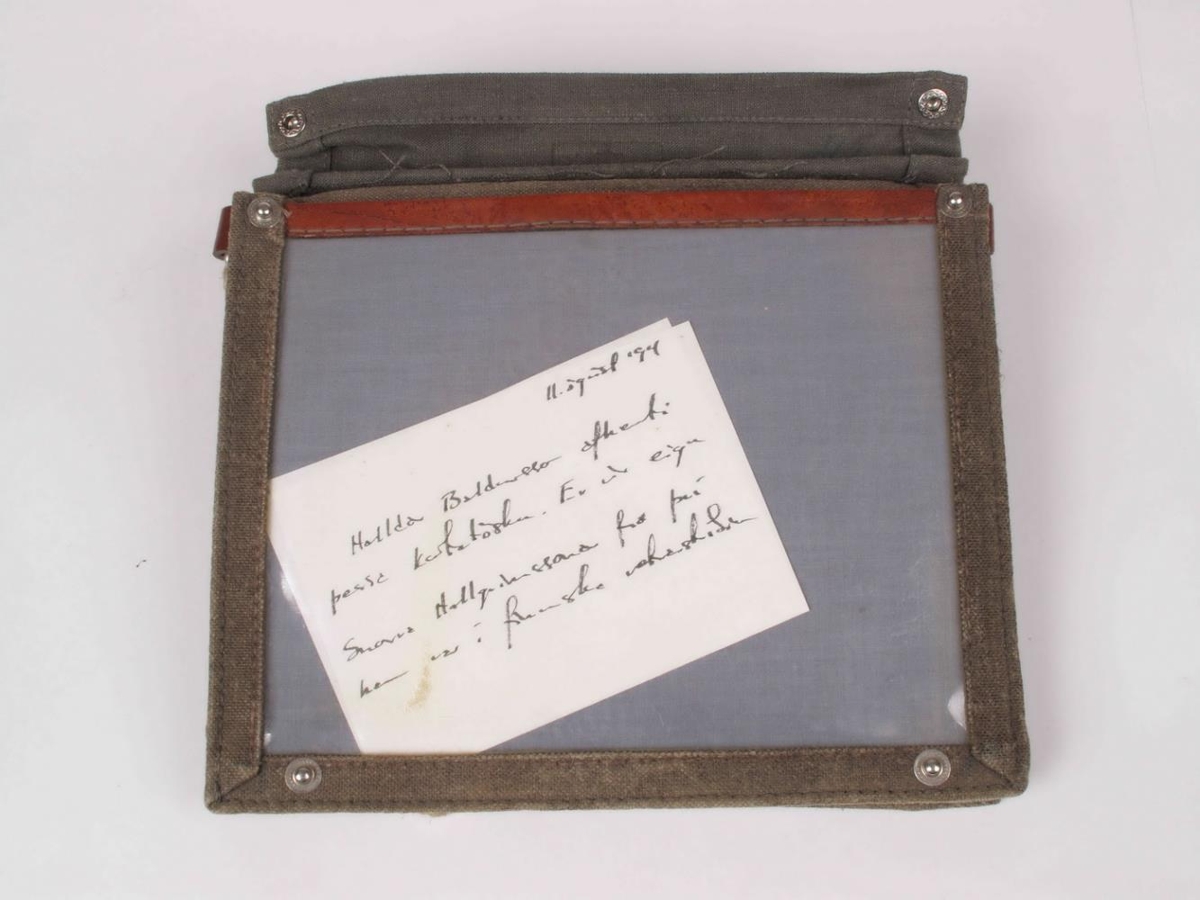 Halldór Baldursson afhenti þessa kortatösku. Hún er úr eigu Snorra Hallgrímssonar frá því hann var í Finnska-Vetrarstríðinu. Taskan er samansett af tveimur hólfum, fremra hólf er með gegnsæju plasti. Taskan er smelt með 2 smellum að framan. Taskan er græn að lit með axlaról úr snæri.