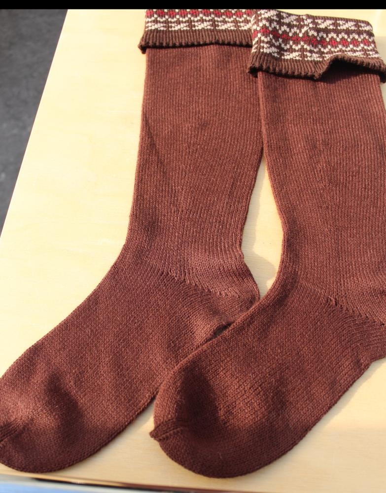 Sokkar - Brúnir reiðsokkar með uppábroti. Rauður og drapplitur munsturbekkur á uppábroti.