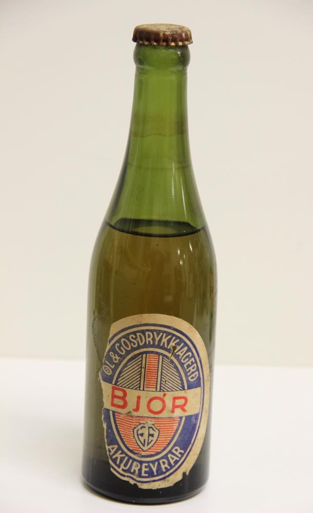 Bjórflaska, græn að lit með gylltum/ryðguðum málmtappa og álímdum miða í bláum og rauðum lit sem á stendur: Öl og gosdrykkjagerð Akureyrar - Bjór - og stafirnir E.E. Neðan á flöskunni stendur: Bottle made in England - J505 - UGB. Flaskan er 23,5 cm á hæð og 6,5 cm í þvermál.