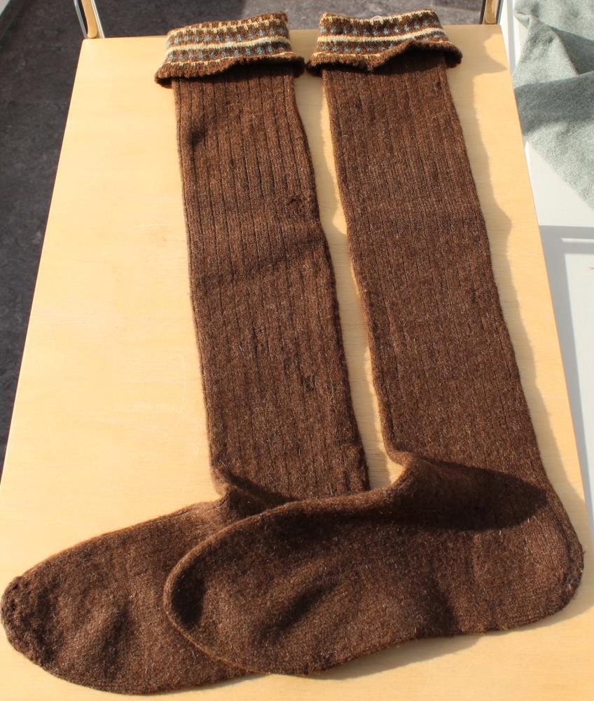 E og F- Mórauðir úr mjög fínu bandi. Garðaprjón á hælum, stoppað í. Efst er ljós munsturbekkur.