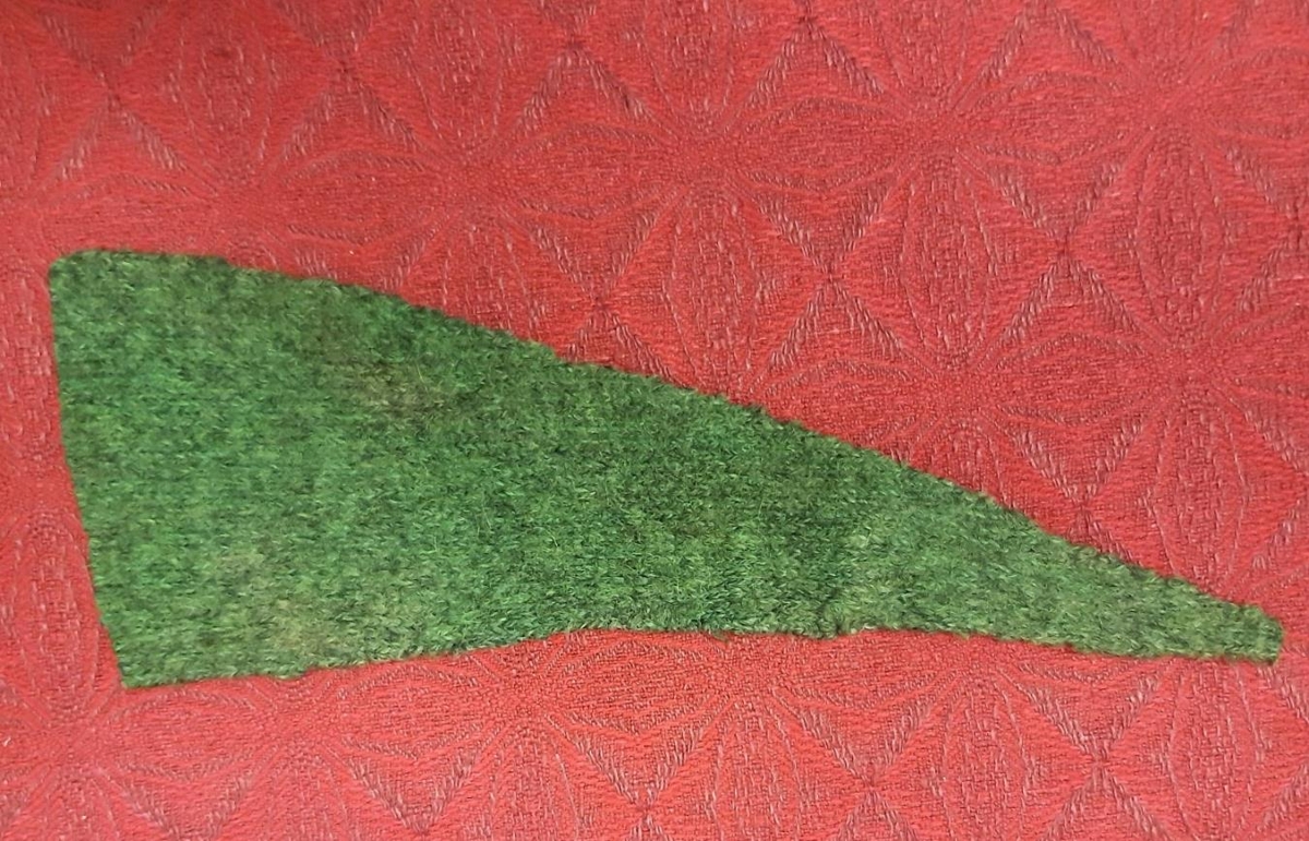 Bútur úr vélprjónuðu efni úr heimaunninni ull. Tveir grænir litir kemdir saman. Hnuðlað (þæft).