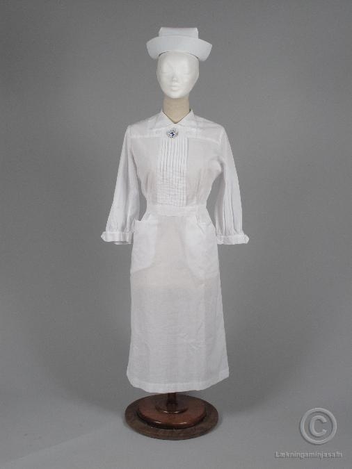 Hvítur kjóll úr þunnu bómullarefni. Beinn með falli að aftan tekinn í sundur í mittið með líningu. Blússa heil að framan, berystykki 10 lek saumuð niður undir leki og mittisgjörð 3 tölur á berustykki flibbakragi þinnist út að aftan. Renndur að aftan niður fyrir mitti kvartermar rikktar að framan undir líningu. Stórir vasar á pilsi. Kappi hefur a.ö.l. verið borin við kjólinn 2007-42.
