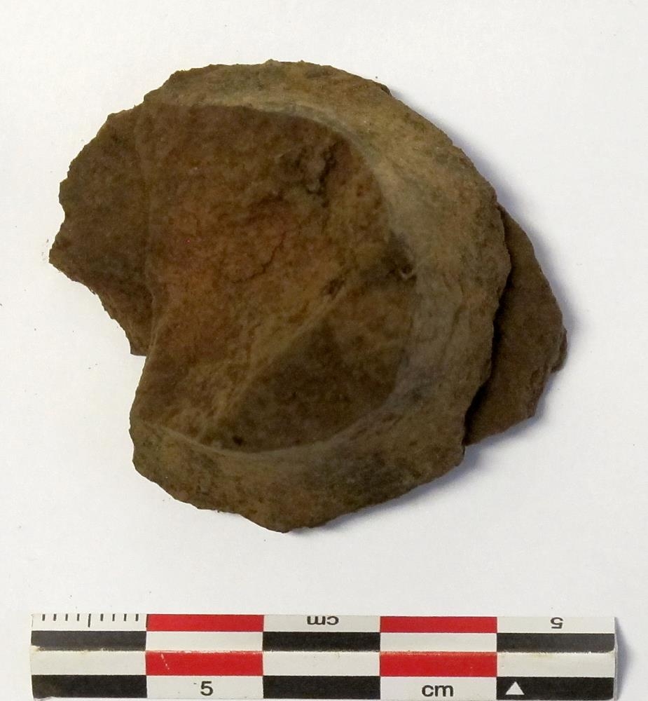 Tvö rauðbrúnleit leirkersbrot úr rauðleir. Hluti af þrífættum potti, glerungur sjáanlegur að innanverðu. Fannst við hreinsun utan við byggingar.