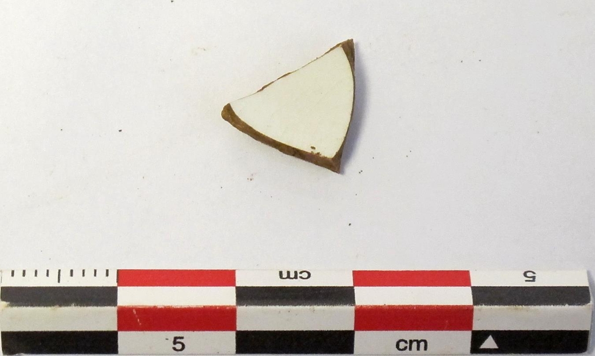 Lítið hvítt keramikbrot. Fannst við hreinsun utan við byggingar. Brotið vigat 1>.