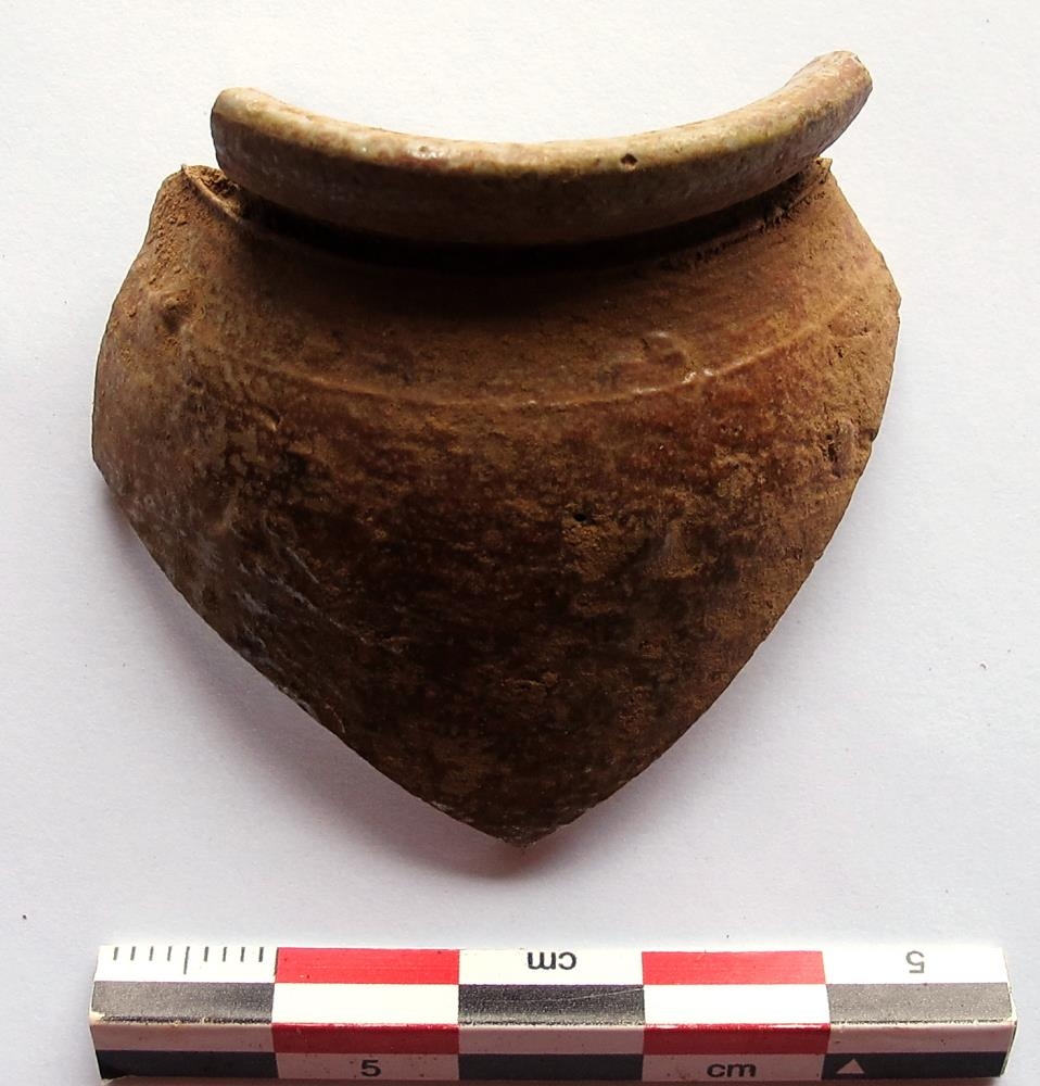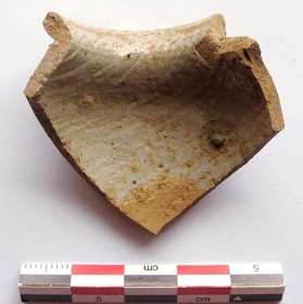 Brot úr lítilli smyrlakrús úr steinleir. Ljósbrúnn glerungur að utanverðu. Ljósgrár glerungur að innanverðu.