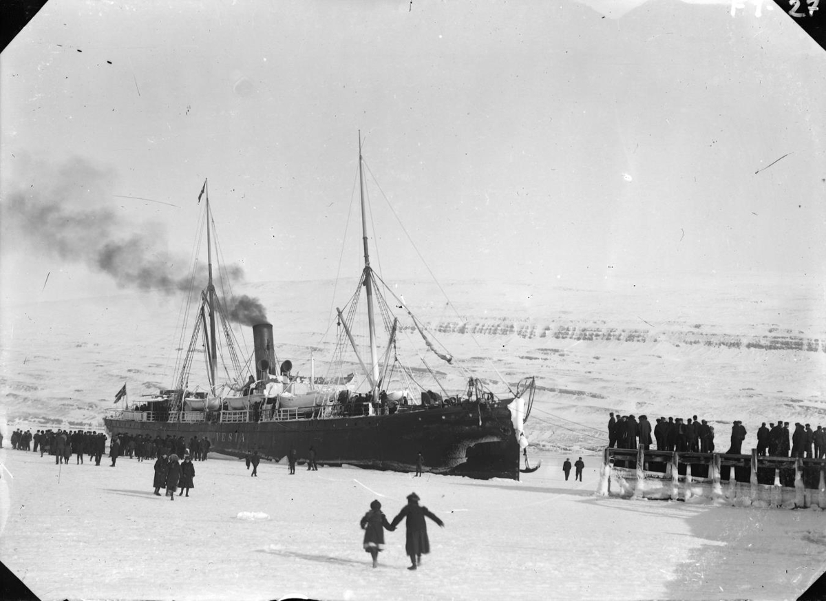 Strandferðaskipið "Vesta" fast í ís rétt við Torfunefsbryggju.