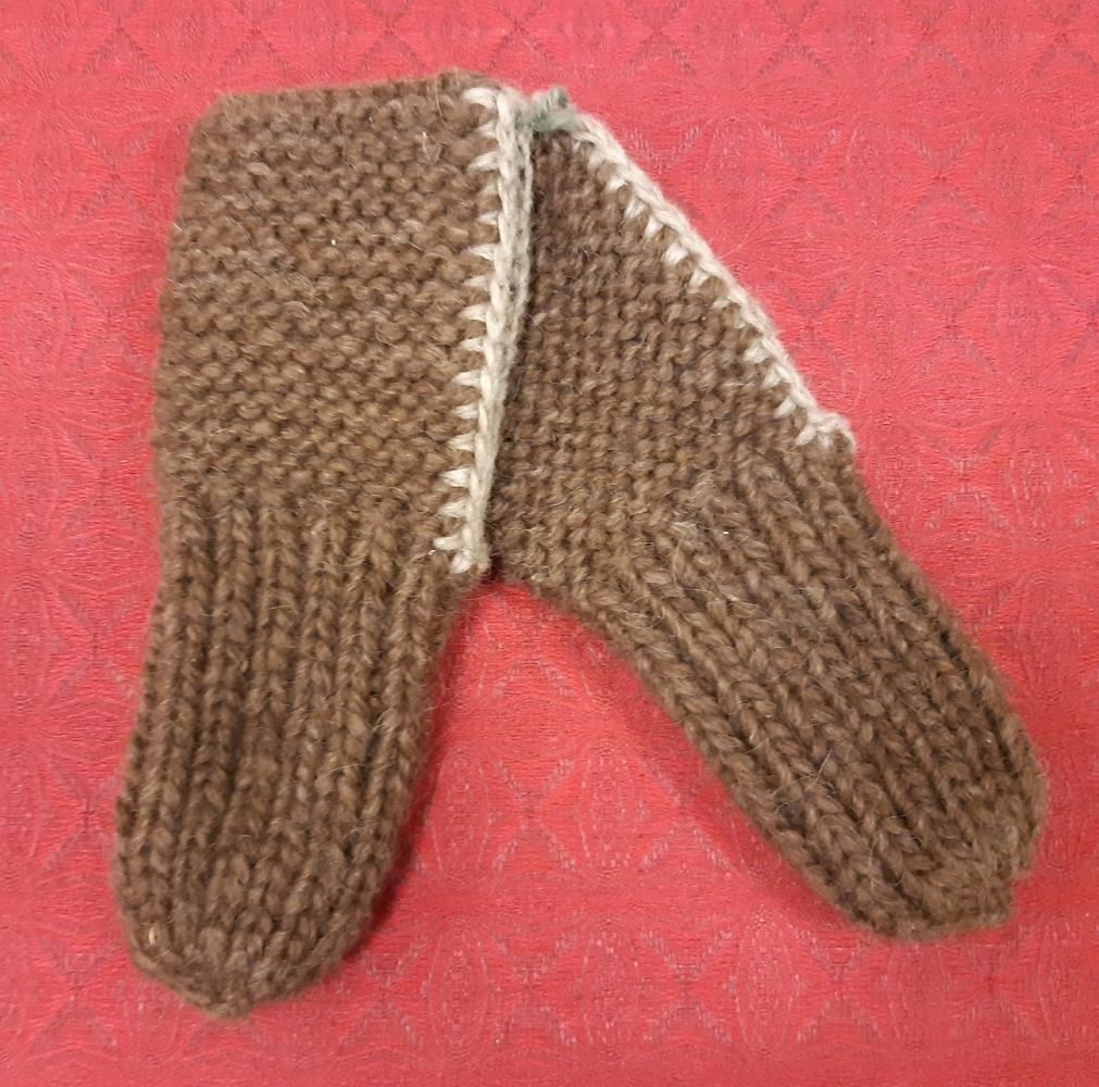 Mórauðar tátiljur úr hespulopa. Prjónaðar með stuðlum og garðaprjóni. Heklað utan með með gráu.