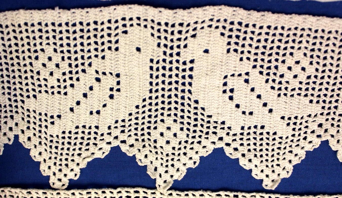Blúnda - Blúnda neðan á svuntu með fuglum, hekluð úr hvítu garni. - Saga: Elísabet Sigurgeirsdóttir er tengdadóttir Dómhildar. Dómhildur Símonía Jóhannsdóttir (1887-1967)