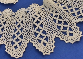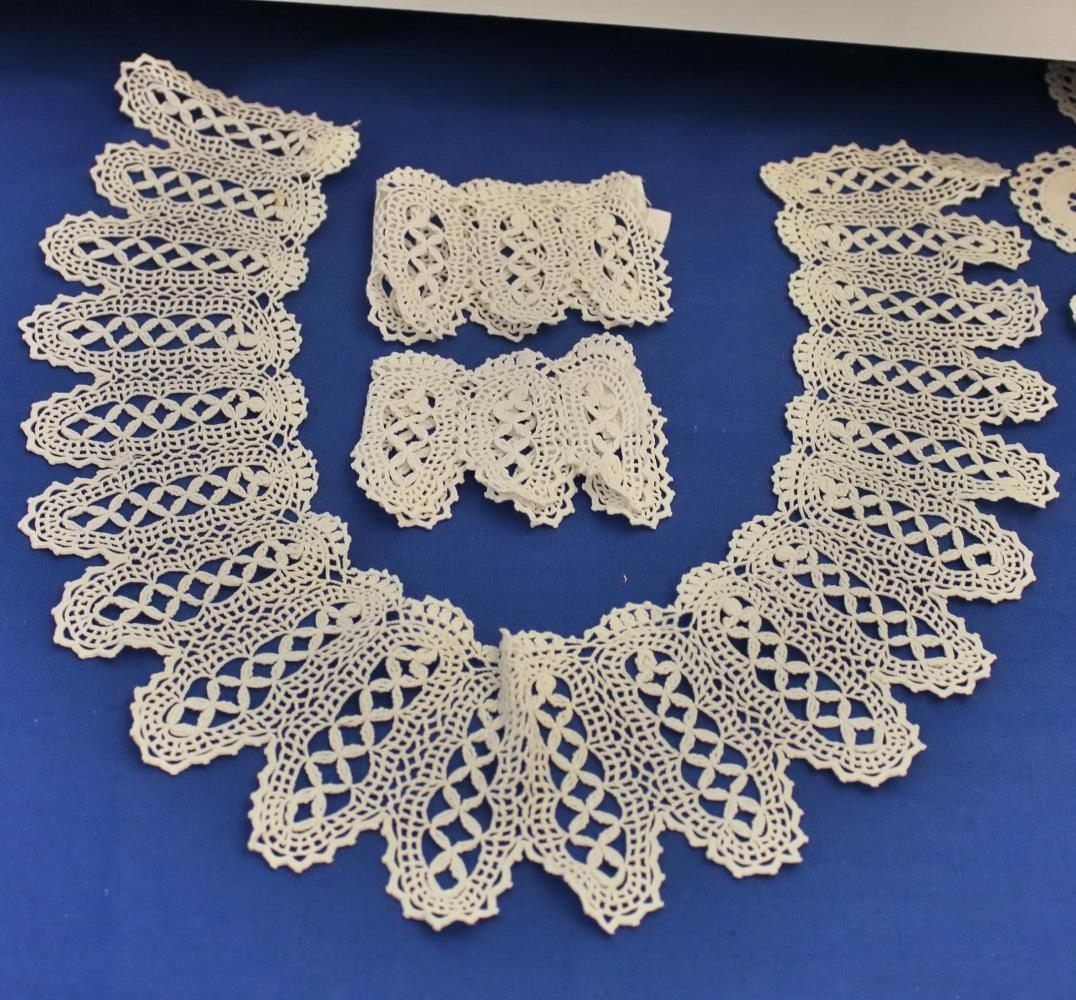 Kragi og ermaupplagnir - 1610 A, B og C. A- Heklaður kragi. 54 cm upp í háls. Munstrið myndar tungur sem eru 8 cm langar. B og C- Heklaðar ermaupplagnir. 18 cm á lengd og 8 cm á breidd. - Saga: Tilheyrði Mjóadalsfólkinu. Hlutinn gerði Þorgbjörg Guðmundsdóttir(1885-1920) frá Mjóadal Komudagur 6. júlí 2000