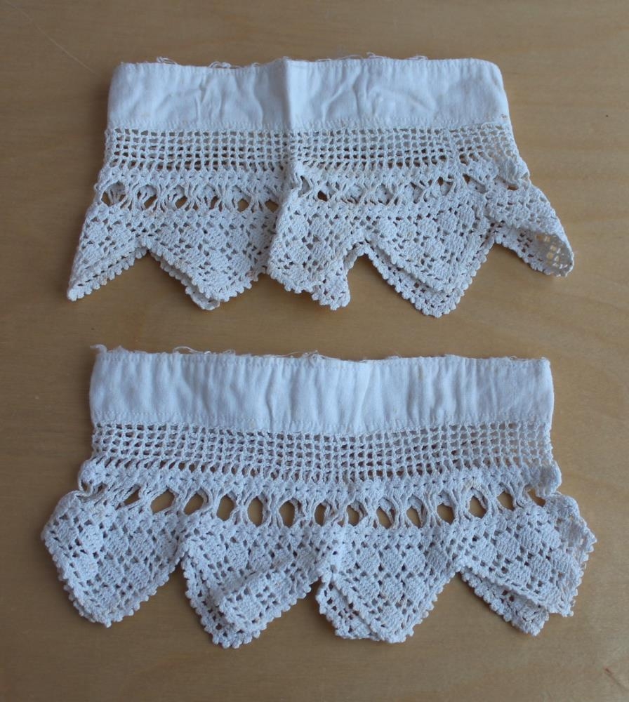 Nærbuxnaskálmar - A og B. Hekluð blúnda á léreftsræmur. Hvítt. 8 langar tungur í blúndunum.