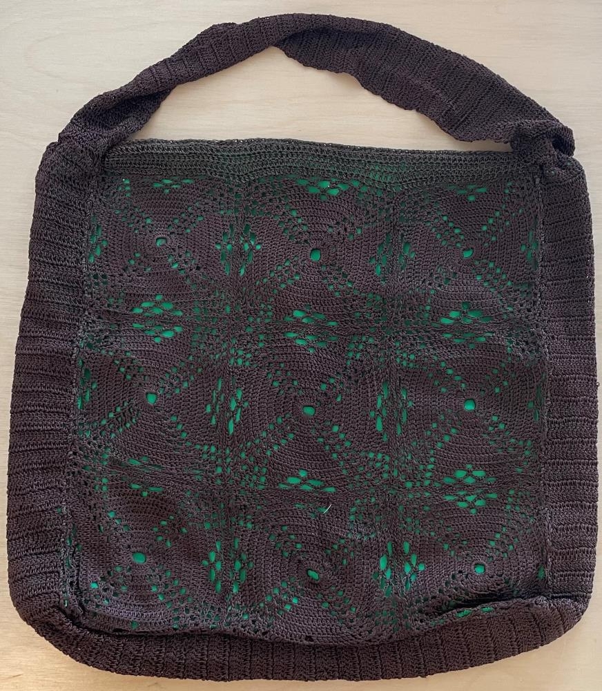 Taska hekluð úr silkigarni. Band yfir öxl 67 cm. langt. Níu dúllur eru heklaðar saman, hliðar og botn heklaðar með föstum pinna. Fóðruð með grænu, í fóðrinu er vasi með rennilás. Taskan er brún.