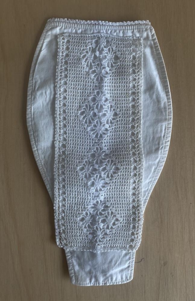 Peysubrjóst með 20 cm. blúndu sem er hekluð úr hvítu heklugarni, pinnahekl, fjórir tíglar í miðju.