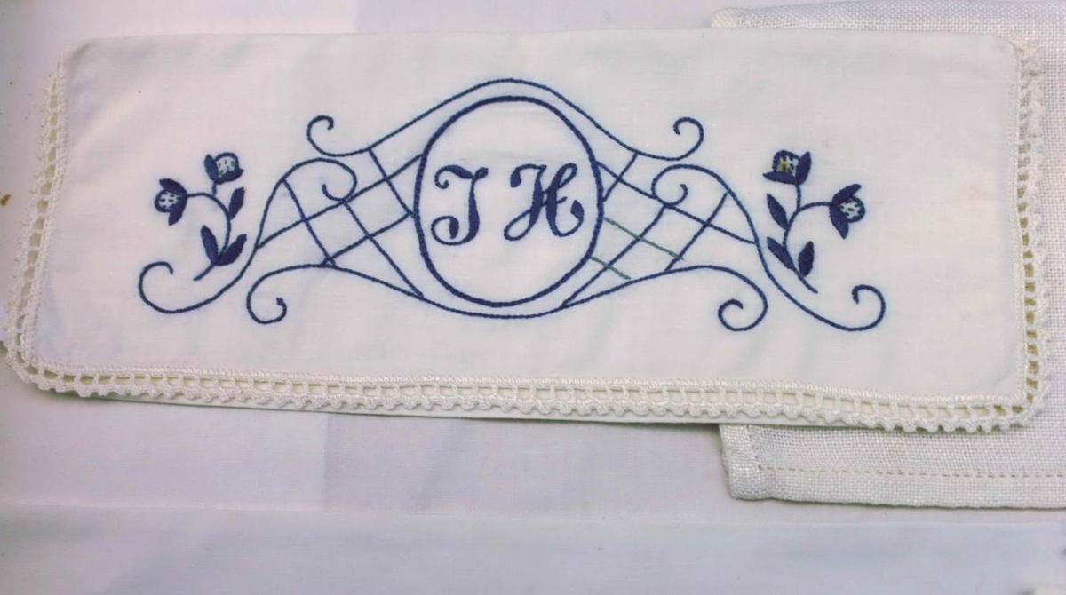 Servíettupoki - Hvítt léreft, hekluð mjó blúnda utan um. Saumað með bláu áróragarni stafirnir I.H. kontorstingur. Til hliðar flatsaumur. - Saga: Eig. og gef. Ingibjörg Hjálmarsdóttir (f. 20.01.1913) var á Kvennaskólanum á Blönduósi, 1932-1933.