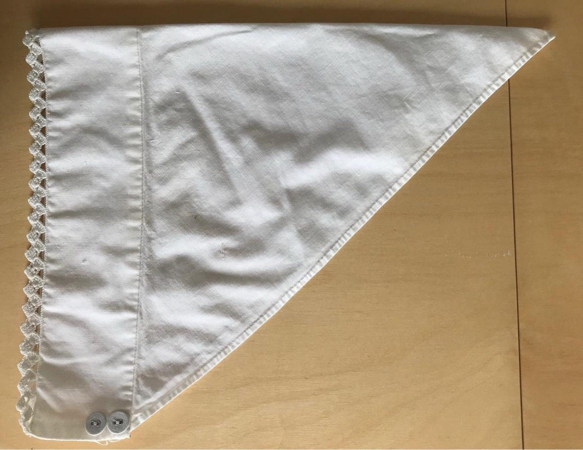 Eldhúskappi - Hvítt léreft. Hekluð blúnda framan á kappann. Tvær tau tölur og kappmellaðar lykkjur á móti tölunum. Skyldustykki 1943.