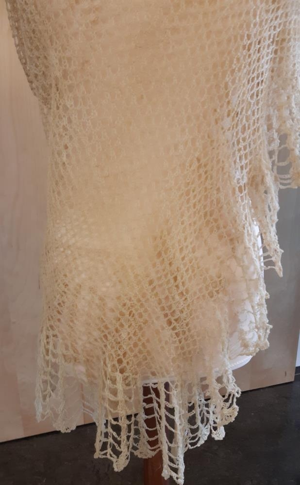 Hvítt stórt ferkantað sjal úr togi með stórri blúndu. Munsrið er út frá miðju og einfalt munstur í sjálfu sjalinu og stærra í blúndunni.
