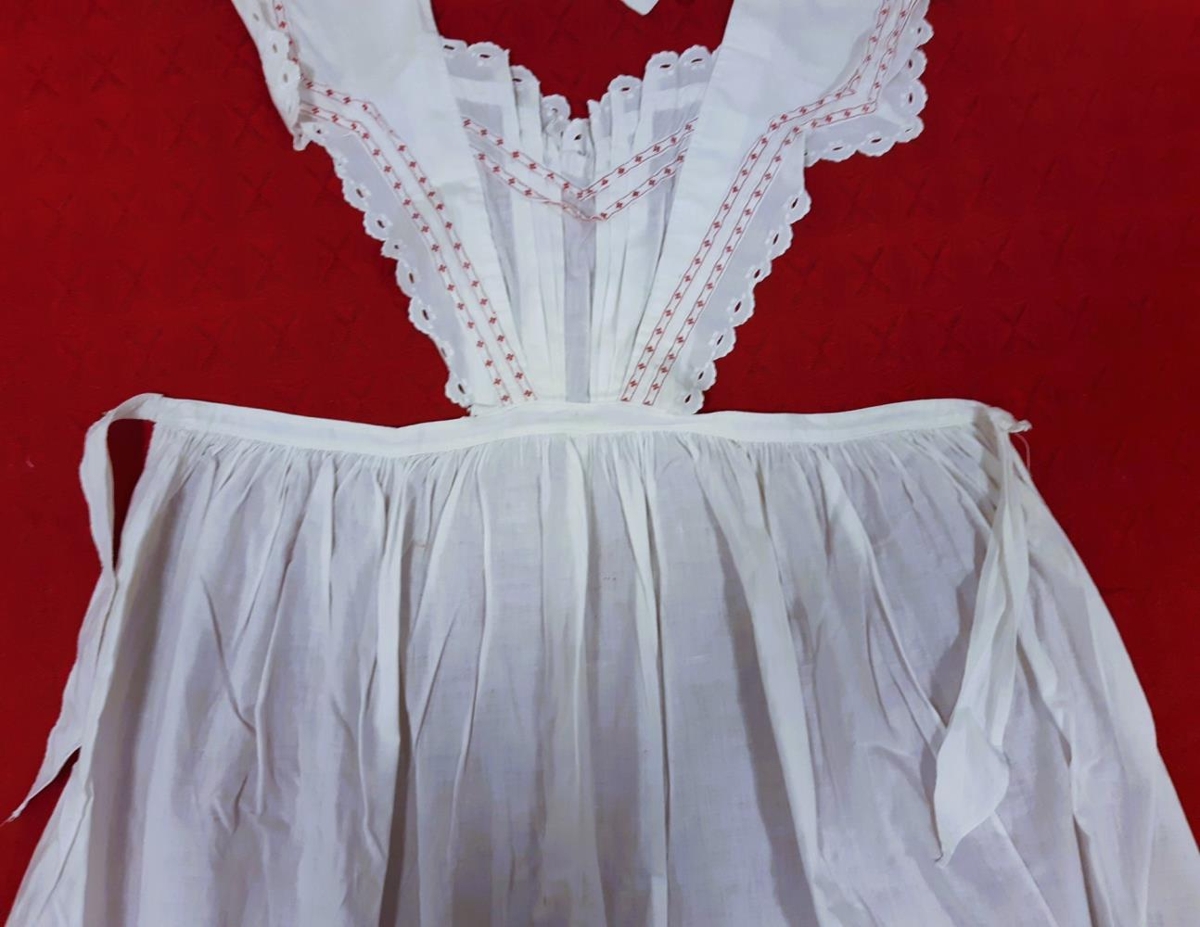 Léreftssvunta. Neðan á henni eru fimm lek. Á svuntunni er felldur smekkur. Hún er skreytt með rauðmunstruðum leggingum. Í hálsmáli og handvegi er heimasaumuð blúnda. Axlastykki er saumað meðfram smekknum. Í axlastykkinu er bönd sem eru hneppt aftur fyrir í strenginn. Hnappagöt eru kappelluð og í streng eru léreftstölur.
