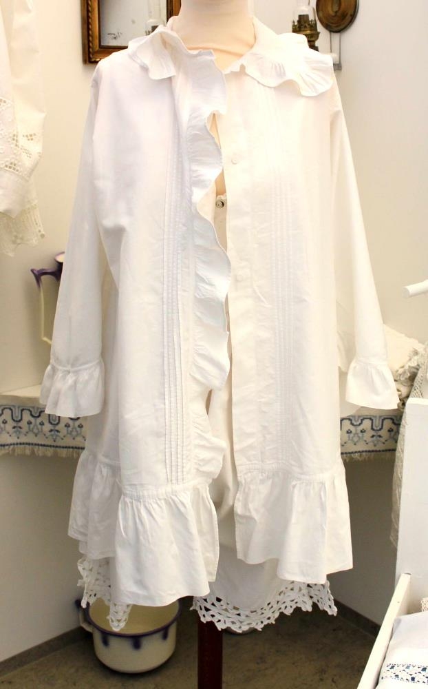 Sloppur, snyrtisloppur úr hvítu lérefti. Með pífum og kraga úr lérefti. Rykkt borð yfir hneppingu framan á. Á hvorum boðungi eru fjögur lek.
