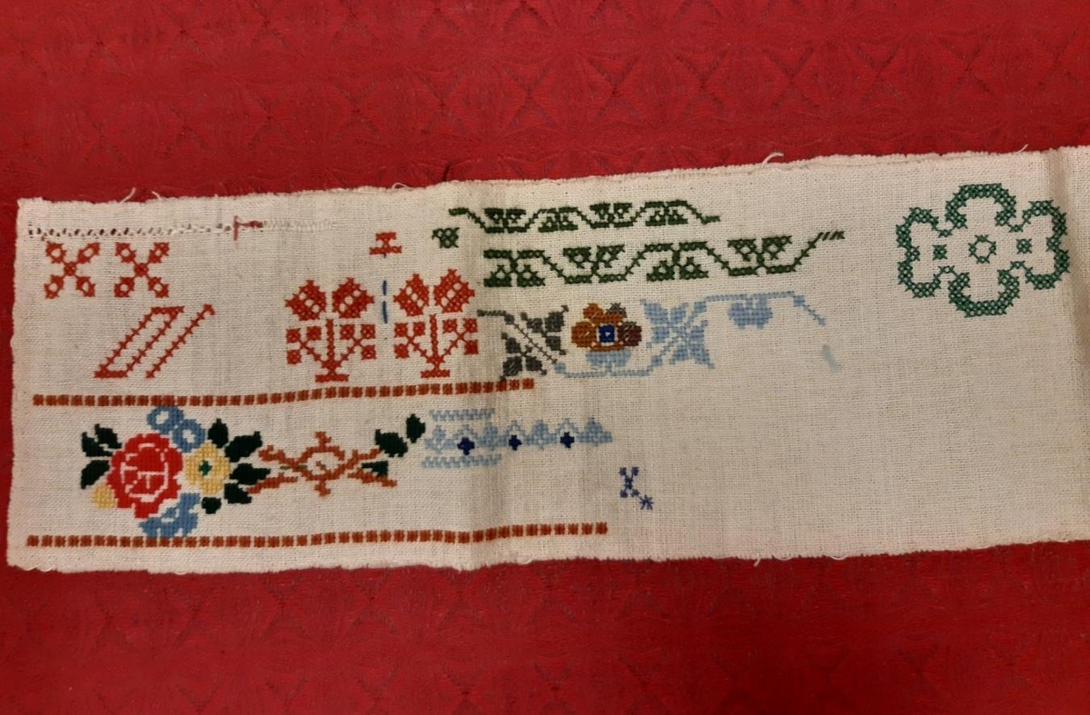 Saga: Fólk tók upp munstur hvert hjá öðru þegar lítið var um munsturbækur. Gefandi Elísabet Sigurgeirsdóttir er tengdadóttir Dómhildar Jóhannsdóttur (1887-1967) sem saumaði klútinn.