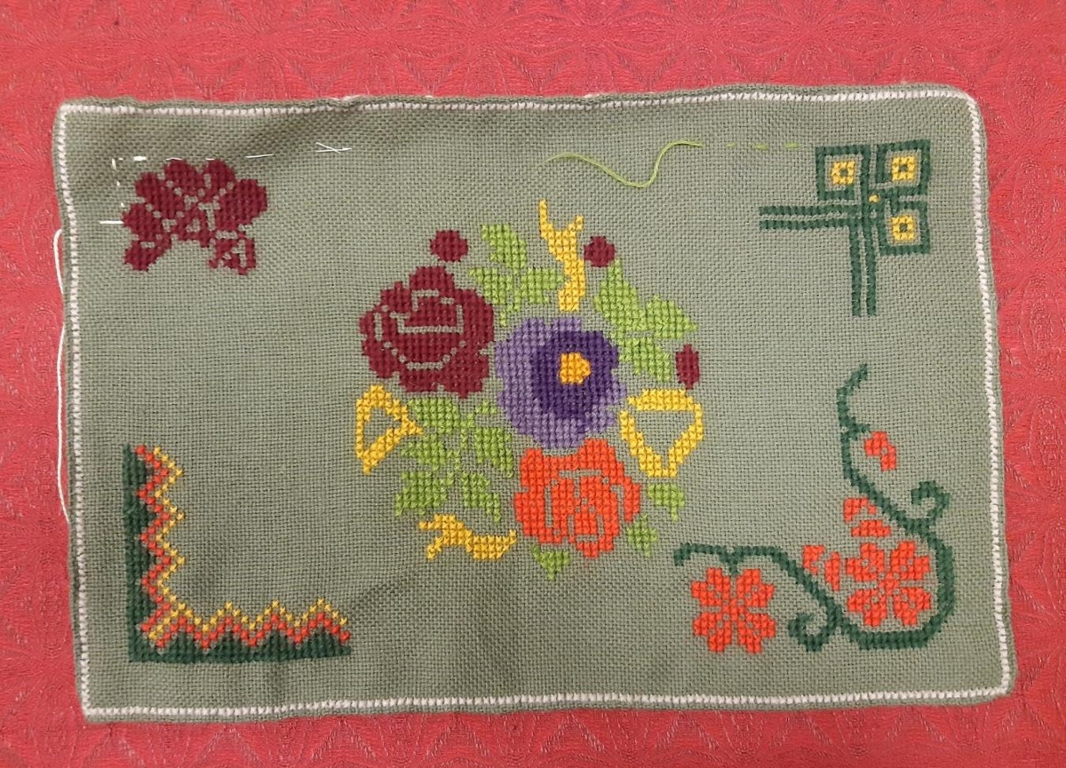 Saga: Fólk tók upp munstur hvert hjá öðru þegar lítið var um munsturbækur. Gefandi Elísabet Sigurgeirsdóttir er tengdadóttir Dómhildar Jóhannsdóttur (1887-1967) sem saumaði klútinn.