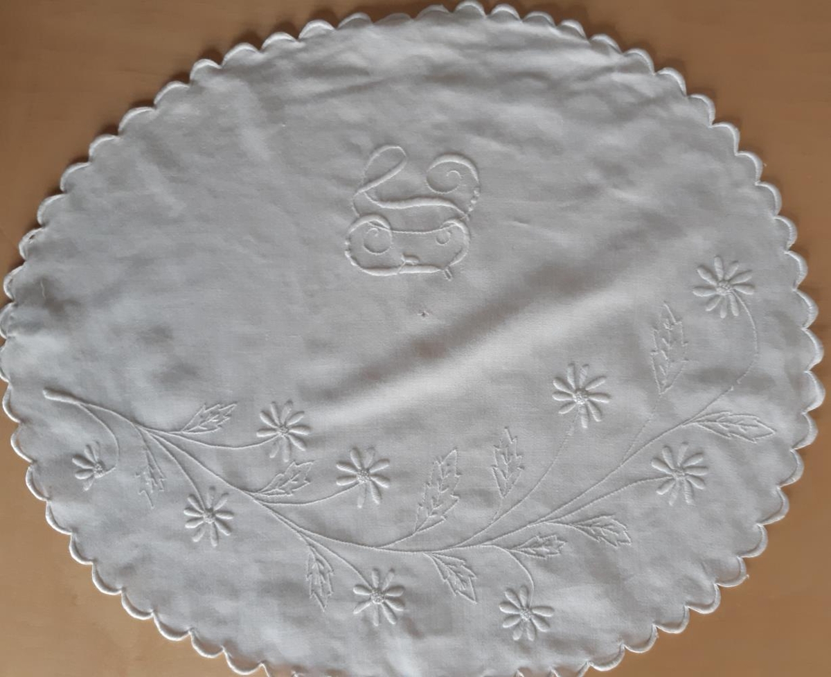 Dúkur úr hvítu lérefti saumaður með flatsaumi, kontorsting og fræhnútum. Umhverfis eru kappmelluð lauf. Einnig stafirnir D.J. með flatsaumi.