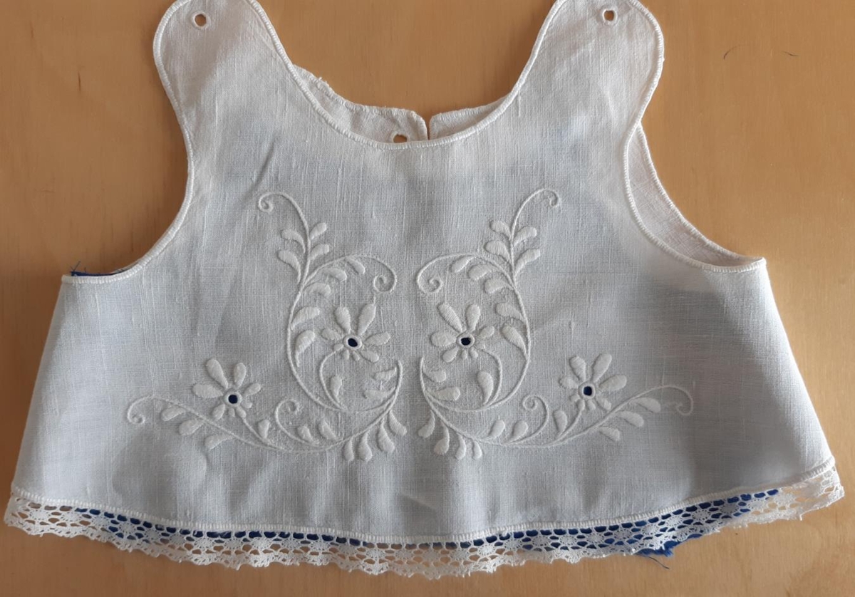 Smekkur úr hvítu lérefti. Saumaður með flatsaumi og kontorsting. Sniðið úr fyrir handveg. Kantar eru kappmellaðir. Einnig göt fyrir reimar á baki og á öxlum. Að neðan er blúnda.