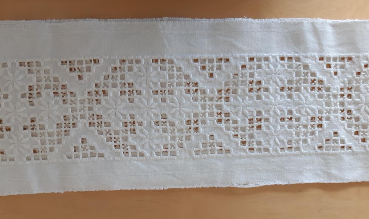 Milliverk, hvítt saumað með harðangri og klaustri.