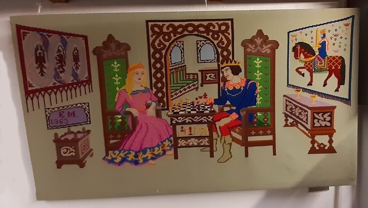 Veggteppi - Á teppinu er mynd af Gunnhildi konungsmóður sitja að tafli við Friðþjóf Nansen. Á vegg hangir mynd af konungi á hestbaki. Í teppið eru upphaftsstafir Elísabetar og ártalið 1963 saumað. Munstrið var keypt hjá Karolínu vefkonu í Reykjavík. Teppið er saumað út í grænan ullarjava með Góbelínsaumi. Skærir litir.