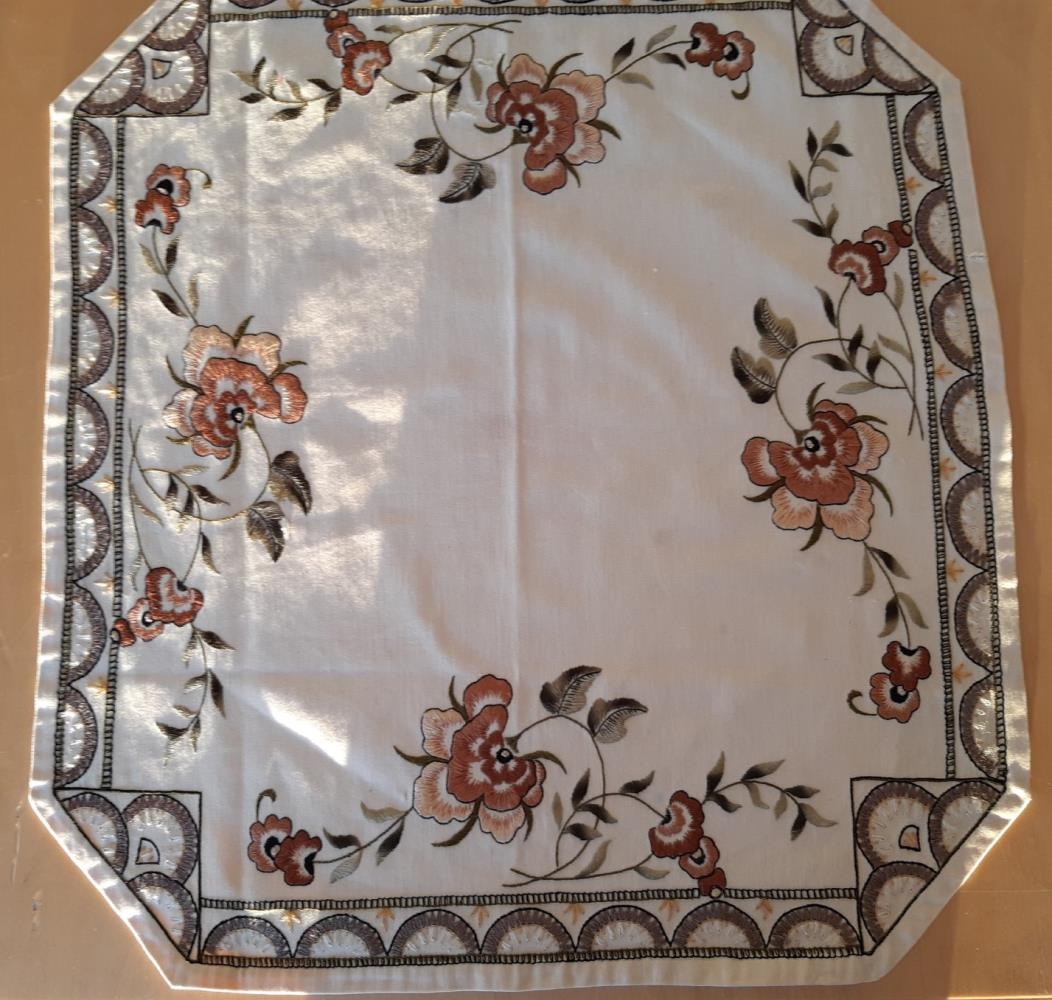 Átthyrndur dúkur saumaður með silkigarni í hvítt efni. Á dúknum eru mislöng spor, kontorstingur, flatsaumur og lykkjuspor. Aðallitir eru brúnir, grænir og svartur.