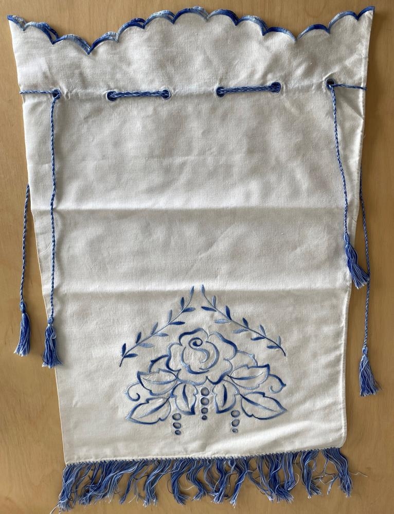 Hvítur óhreinatauspoki úr hör. Útsaumaður með bláu reyrðu perlugarni. Stílíserað blómamynstur er neðst að framan, saumað með flatsaumi. 10 cm blátt kögur er á pokanum. Snúin snúra er þrædd í 12 göt að ofan, endar í dúski. Að ofan eru kappmellaðir tungukantar.