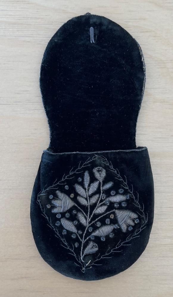Úrhulstur - hulstur (hús) fyrir úr. Svart flauel. Efst á bakinu er krókur. Vasinn er balderaður með blómafötu/vendis munstri. Rammað inn í tígla sem eru saumaðir með grenispori. Stímur á öllum köntum.