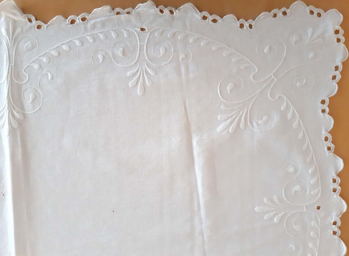Kommóðudúkur úr lérefti með hvítsaumi saumuðum með bómullargarni. Grenisveigar hlykkjast frá einni hlið til annarrar. Sveigarnir slitna og hringast upp í hornum, í miðju að framan, á báðum hliðum og sitthvoru megin við miðju að framan. Mislangur tungukantur er kappmellaður og tvö göt á milli tungna saumuð með enskum saumi.