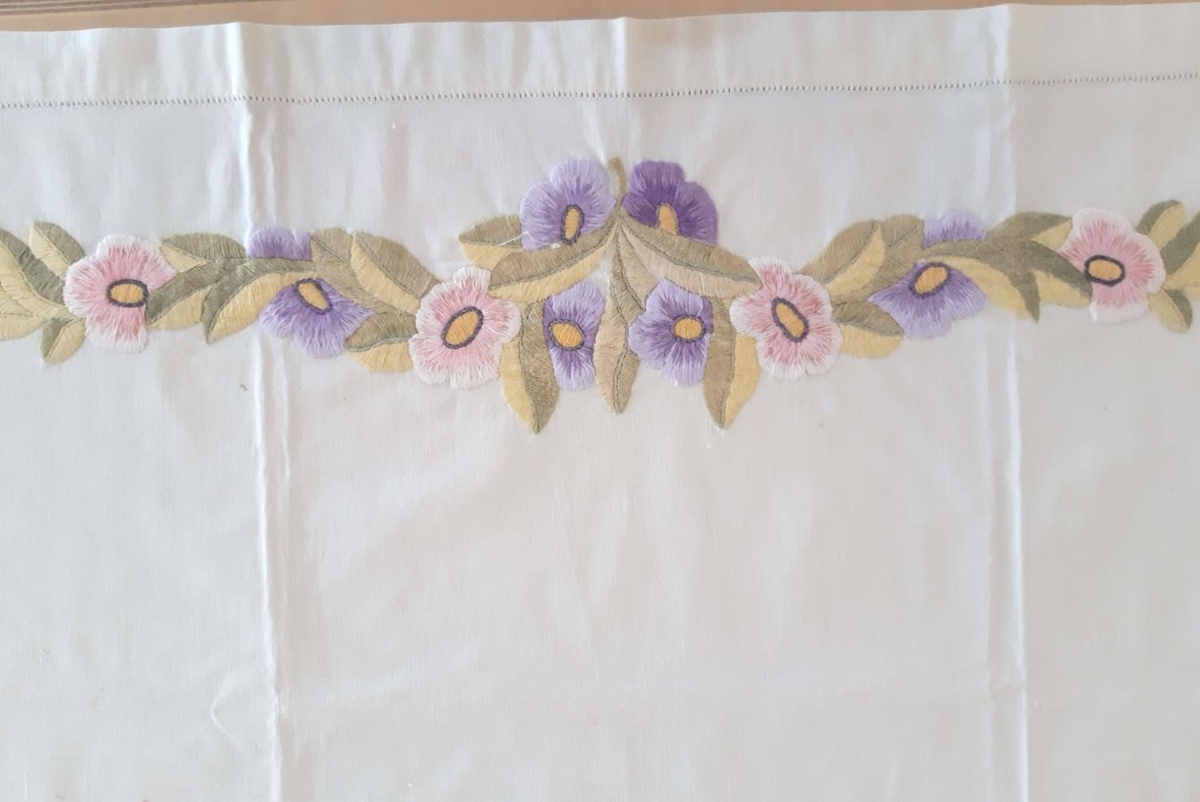 Dúkur - Kommóðudúkur úr rifsi (efni með þéttum upphleyptum röndum). Gulleitur. Blómasveigar fyrir miðju saumaðir með flatsaumi og kontorstingi. Lillablár og bleikir litir í blómunum. Ljósgræna og milligræn blöð með kontorsting í miðju. Hullfaldaður á 3 vegu. Í útsauminn er ýmist notað garn úr viskose eða bómull.
