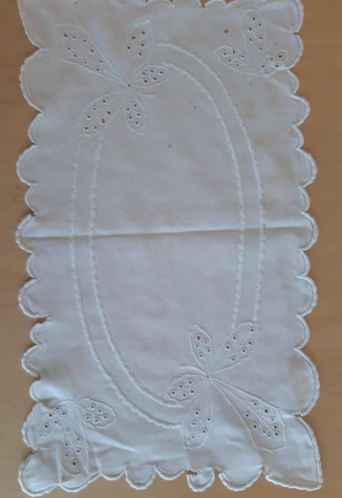 Bakkaservíetta - Útsaumað bómullarefni með hvítsaumi. Sporöskjulagað munstur með laufblöðum. Í laufblöðunum eru göt saumuð með enskum saumi. Kappmellaður tungukantur er utan með.