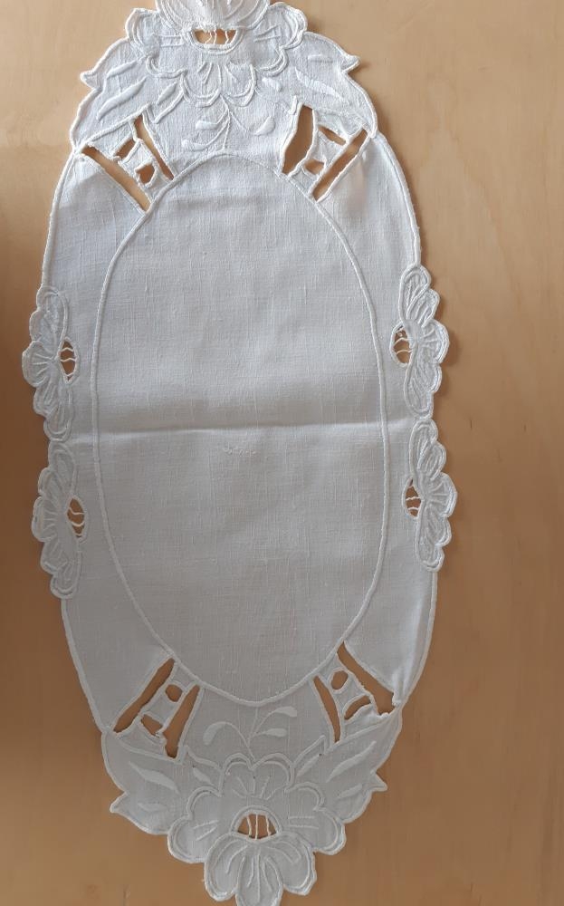 Sporöskjulagaður hvítur hördúkur. Útsaumaðiur með Feneyjasaumi (Venesísku).