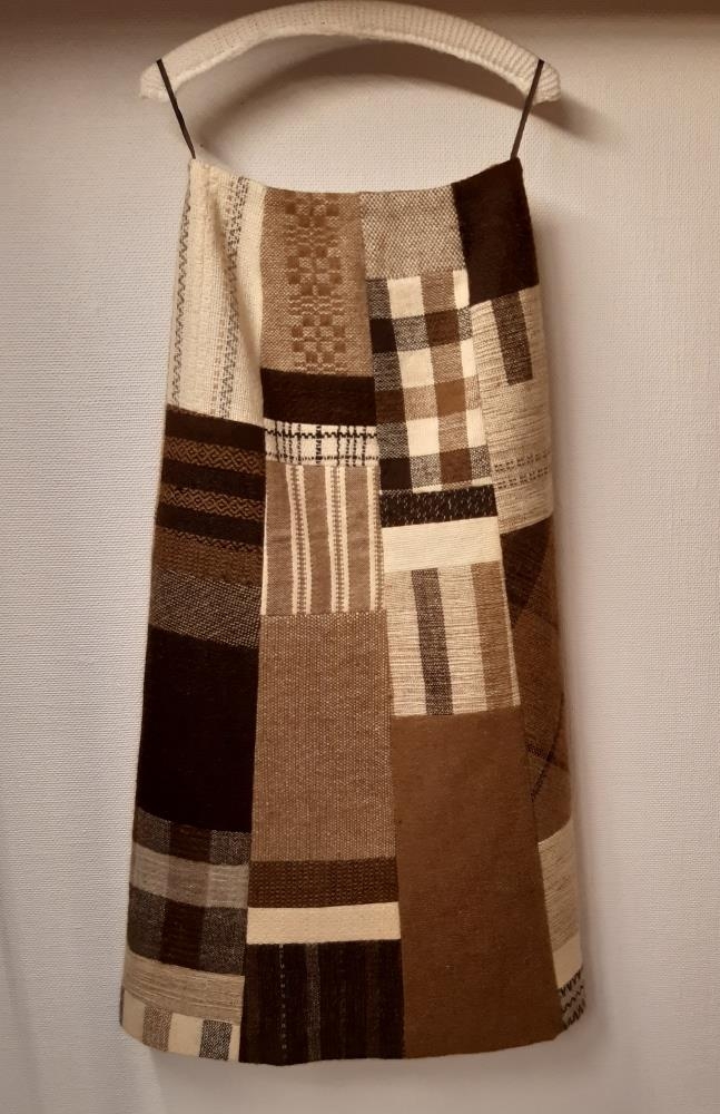 Pils - Sítt pils saumað úr mismunandi stórum bútum úr ofnu efni. Litir í pilsinu eru; hvítt, mórrautt og svart. Meðfylgjandi er mórrautt belti. Pilsið er fóðrað með brúnu pólýesterfóðri. - Saga: Gefið af Sigríði Bjarnadóttur kjólameistara í Reykjavík. Guðrún Vigfúsdóttir frá Ísafirði óf efnið en Sigríður hannaði. Meðfylgjandi í umslagi (nr. 1698) er teikning Sigríðar af peysu sem fylgdi pilsinu. Komudagur 27 júní 2002 Sigríður Bjarnadóttir (1929-2013)