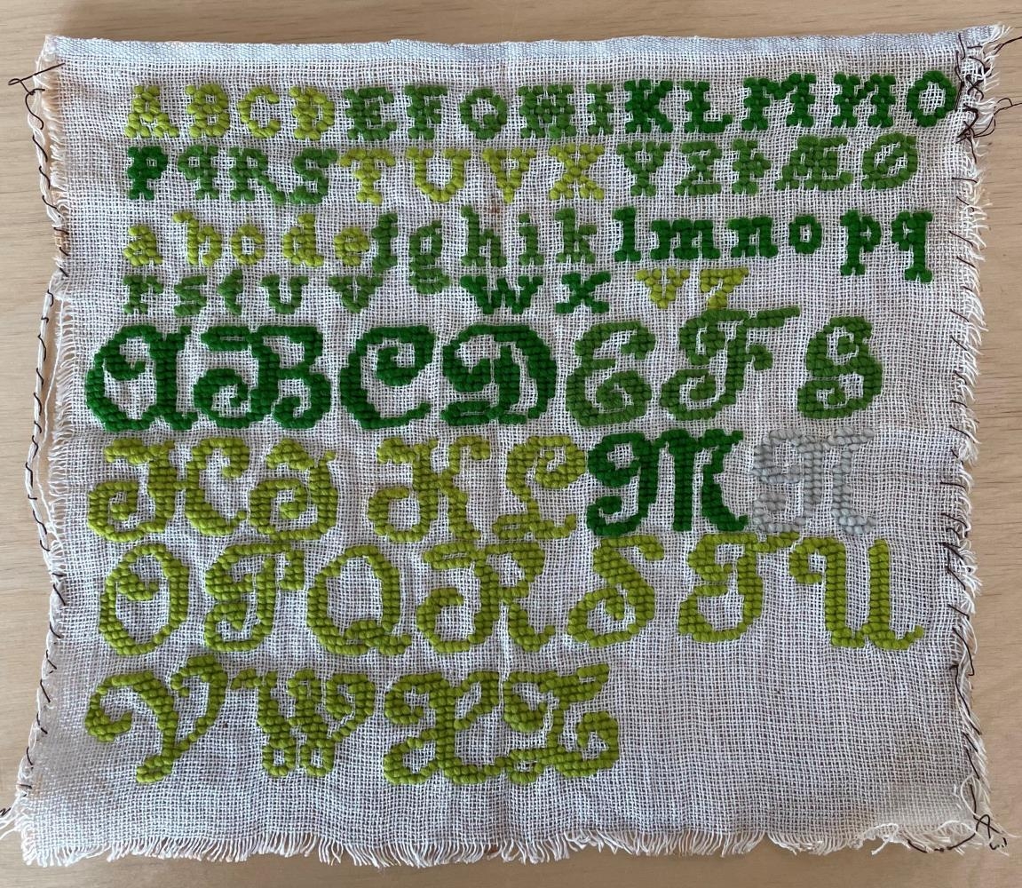 Stafaklútur - Krosssaumur í stramma. Saumað í með ullarbandi í fjórum mismunandi grænum litum.