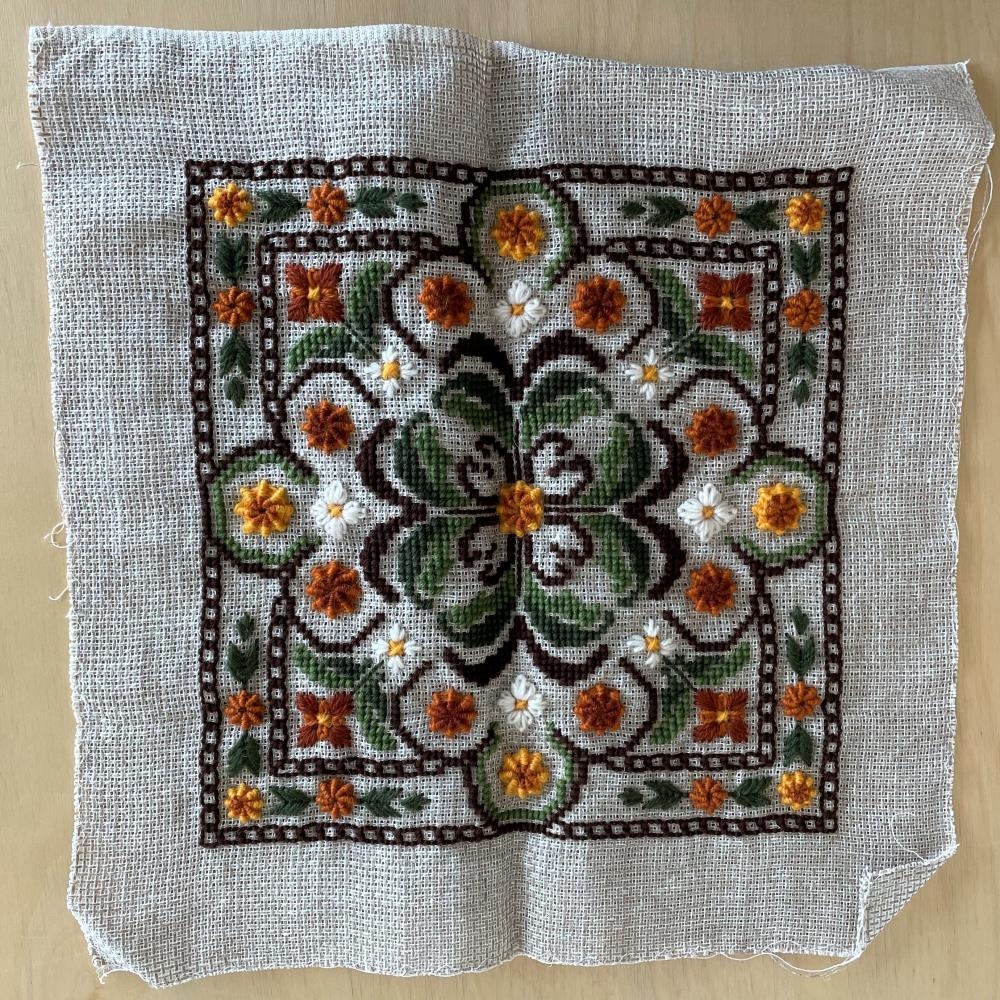 Púðaborð. Munstrið er 28,5x28 cm. Ullargarn í hörjafa. Ýmsir litir. Krosssaumur, afturstingur, lykkjuspor, vafið upp í rós.